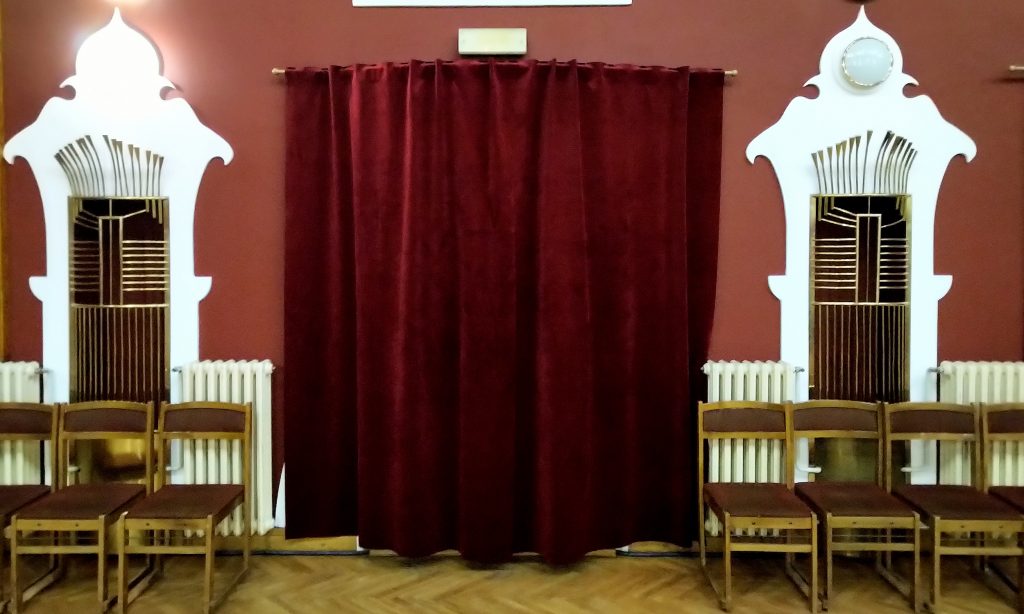 Ilyen akusztikus függöny került a Népkör Kosztolányi Dezső termének minden ajtajára, a balkonra és a színpad fölé (Fotó: Tóth Imre)