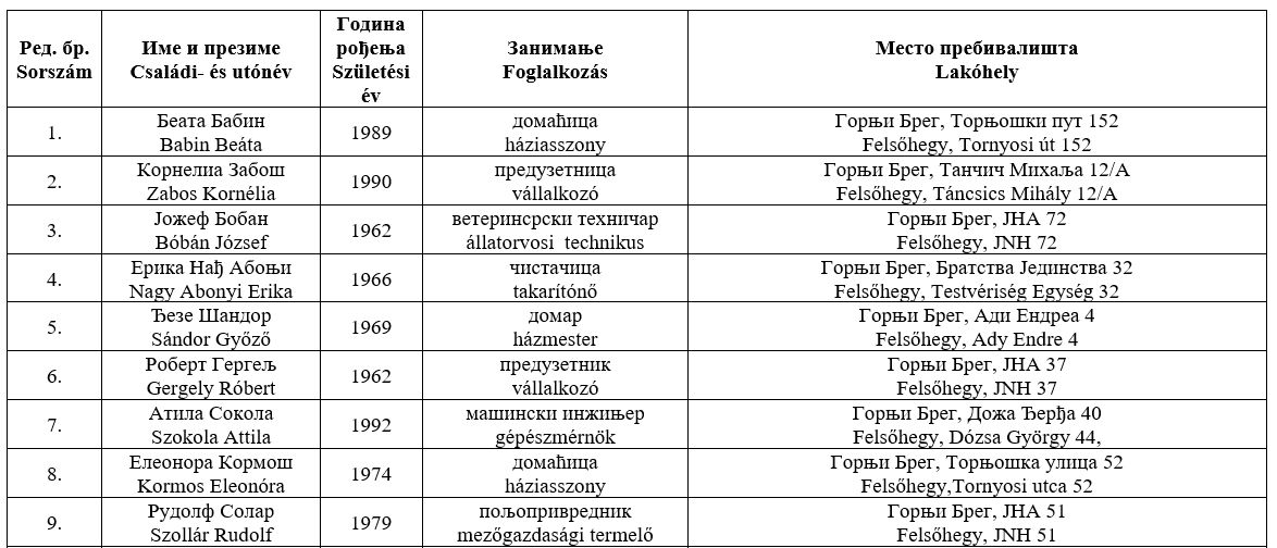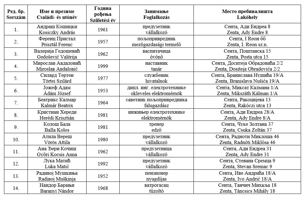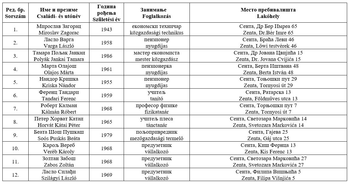 Zentán a Kertek, valamint a Centar-Tópart helyi közösségekben a Jobb Zentáért elnevezésű csoport indít 3-3 képviselőt a VMSZ-Haladó listával szemben: a Kertek esetében a 10., a 11. és a 12., a Centar-Tópart esetében pedig a 11., a 12. és a 13. sorszám alattiak a Jobb Zentáért jelöltjei.