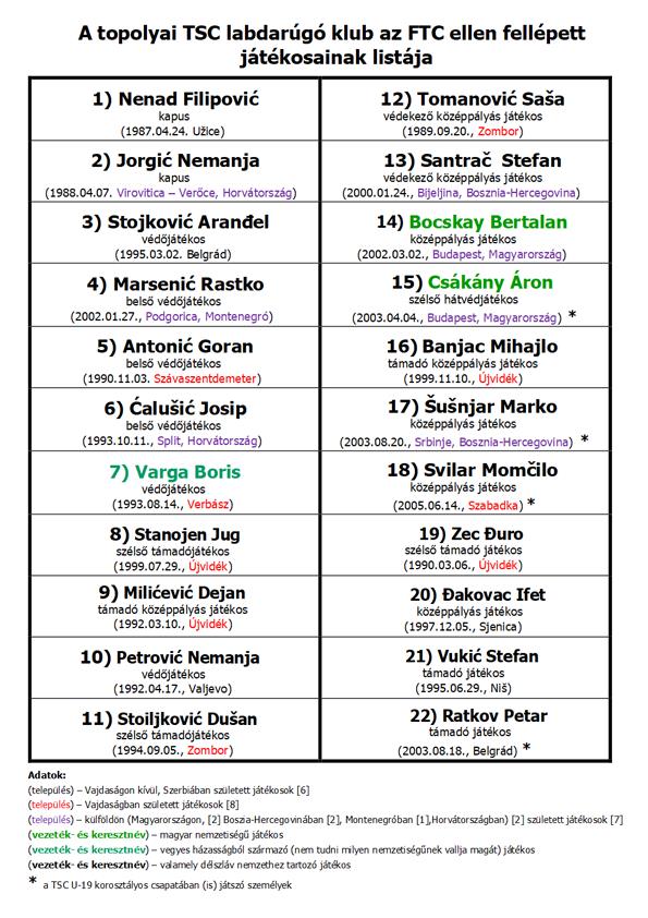Számomra a legbizarrabb történés (és háttere) az új topolyai labdarúgó stadion pályaavatója volt. Mindezt a fociőrültek óriási eredményként könyvelték el, hiszen a TSC profi csapata még a nagy hírű Fradit is legyőzte. Én is szeretem a focit, mégsem elégedtem meg a felszínnel, ugyanis annak kicsinyke megkaparását követően igencsak sok probléma jelent meg. Először is megvizsgáltam a TSC csapatában pályára lépett huszonkét játékos adatait: