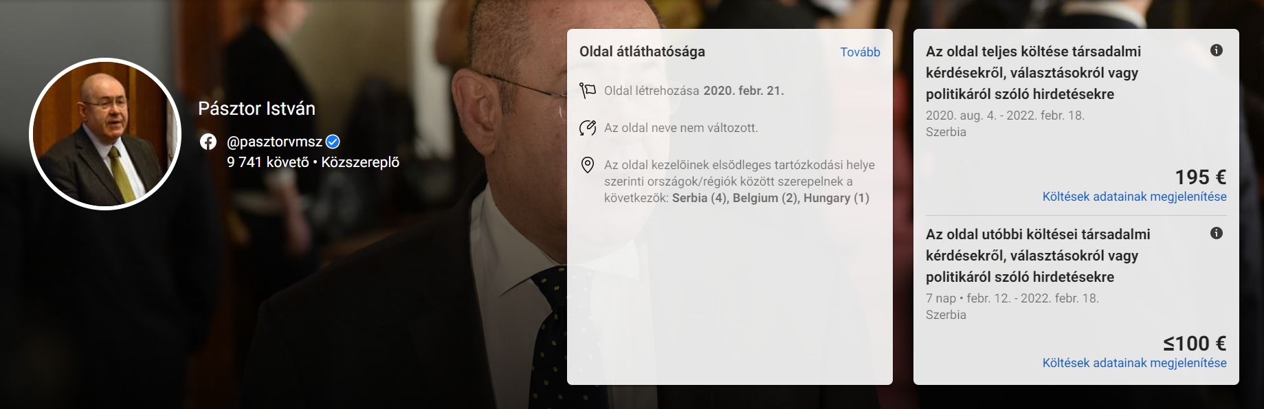 A Vajdasági Magyar Szövetség elnöke, Pásztor István korábban sem állt nagy Facebook-betyár hírében, hiszen csak 2020. február 21-én csatlakozott a közösségi oldalhoz, s azóta 195 eurót költött el hirdetésre, amelyet teljes mértékben a VMSZ fizetett, nem pedig a tartományi parlament elnökének oldala.