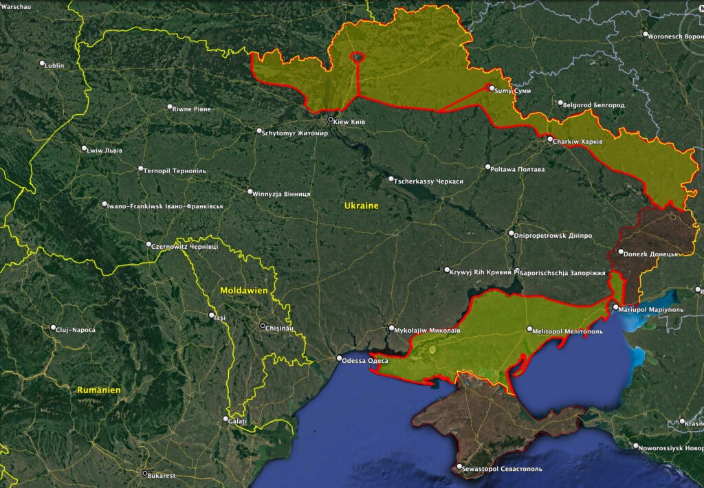 A sárgával jelölt területek állnak orosz irányítás alatt a kedd 22 órai állás szerint – Kép: Julian Röpcke / Twitter