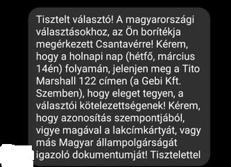 Tisztelt választó! A magyarországi választásokhoz, az Ön borítékja megérkezett Csantavérre! Kérem, hogy a holnapi nap (hétfő, március 14-én) folyamán, jelenjen meg a Tito Marshall 122 címen (a Gebi Kft. Szemben), hogy eleget tegyen, a választói kötelezettségének! Kérem, hogy azonosítás szempontjából, vigye magával a lakcímkártyát, vagy más Magyar állampolgárságát igazoló dokumentumját! Tisztelettel
