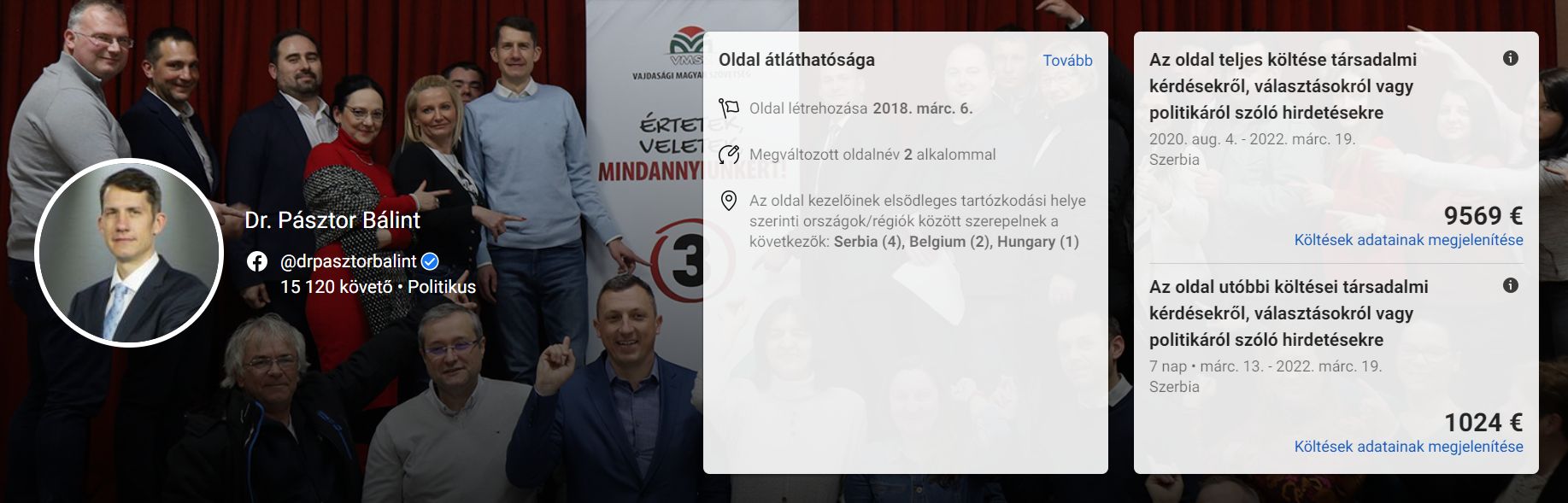 Így történhetett meg, hogy március 13. és 19. közötti időszak alatt Pásztor Istvánnak, a Vajdasági Magyar Szövetség elnökének a Facebook-oldala több pénzt költött hirdetésre, mint a fia, Pásztor Bálint oldala. Az említett időszakban a Vajdasági Magyar Szövetség 1216 eurót költött az elnök bejegyzéseinek népszerűsítésére, míg a fia, vagyis az alelnök bejegyzéseire a párt ezúttal csak 1024 eurót fizetett a Facebooknak. Ami viszont az összesítést illeti, ott a Pásztor Bálint FB-oldal mérföldekkel megelőzi édesapját, hiszen a szabadkai városi-képviselő testület elnökének bejegyzésére 2020. augusztus 4. óta 9569 eurót költöttek FB-hirdetésre, míg a Pásztor István FB-oldal „csak” 4519 euró költésnél jár.