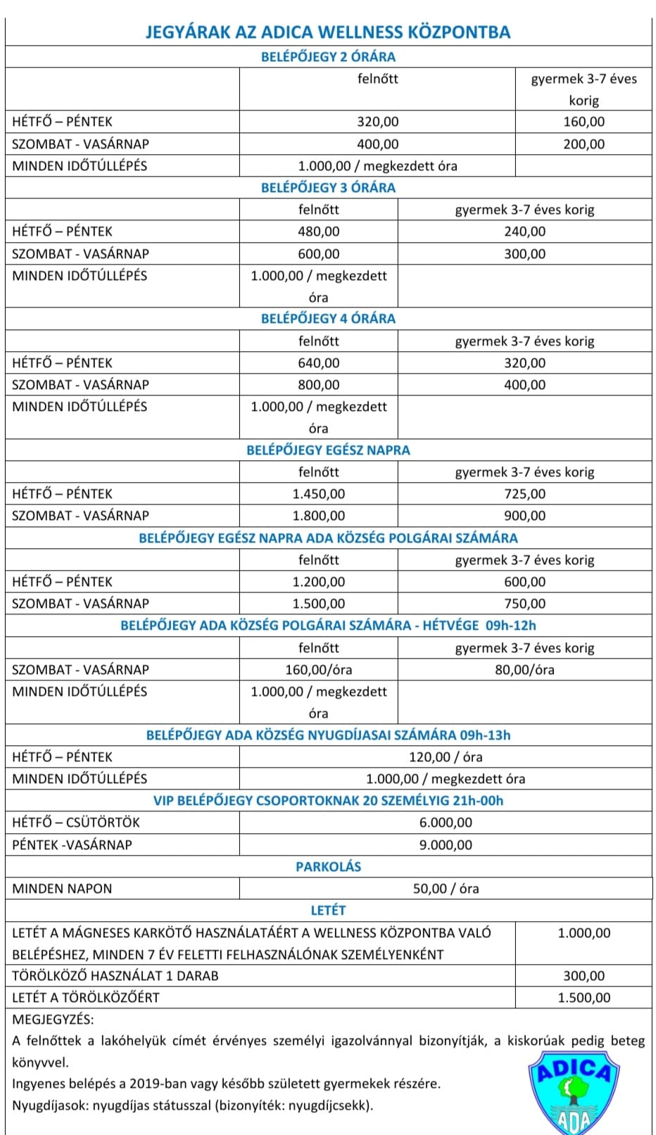 Az adai lakosoknak kedvezményesen vásárolhatnak belépőjegyet: a hét évnél idősebbek hétköznap 1200, hétvégén pedig 1500 dinárért léphetnek be a fürdőbe, a 3 és 7 év közöttieknek pedig hétközben 600, hétvégén 750 dinárt kell fizetniük.