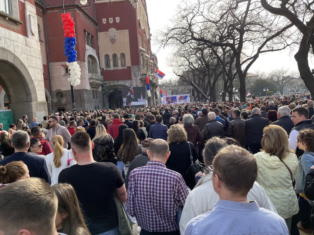 Aleksandar Vučić beszéd elején megkérte a tömeget, hogy tegyék le a zászlókat, hogy elláthasson a közönség végéig, de hozzátette, annak ellenére, hogy nemrég csináltatott szemüveget, mégsem látja a tömeg végét, és ezért köszönetet mondott, majd kifejezte örömét, hogy ilyen sokan kíváncsiak arra, hogy mit akar mondani.