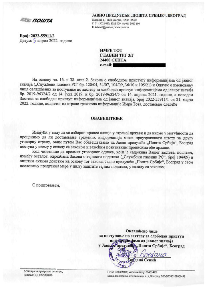 „Tekintettel arra, hogy mindkét országban (szerk.megj: Magyarországon és Szerbiában is) folyamatban vannak a választások, és nincs lehetőségünk felmérni, hogy a kért információk eljuttatása okozhat-e kárt a másik szerződő félnek, ezúton tájékoztatjuk Önt, hogy a Szerb Posta közvállalat – Belgrád mindkét ország törvényeit és vonatkozó pozitív rendelkezéseit tiszteletben tartva jár el.