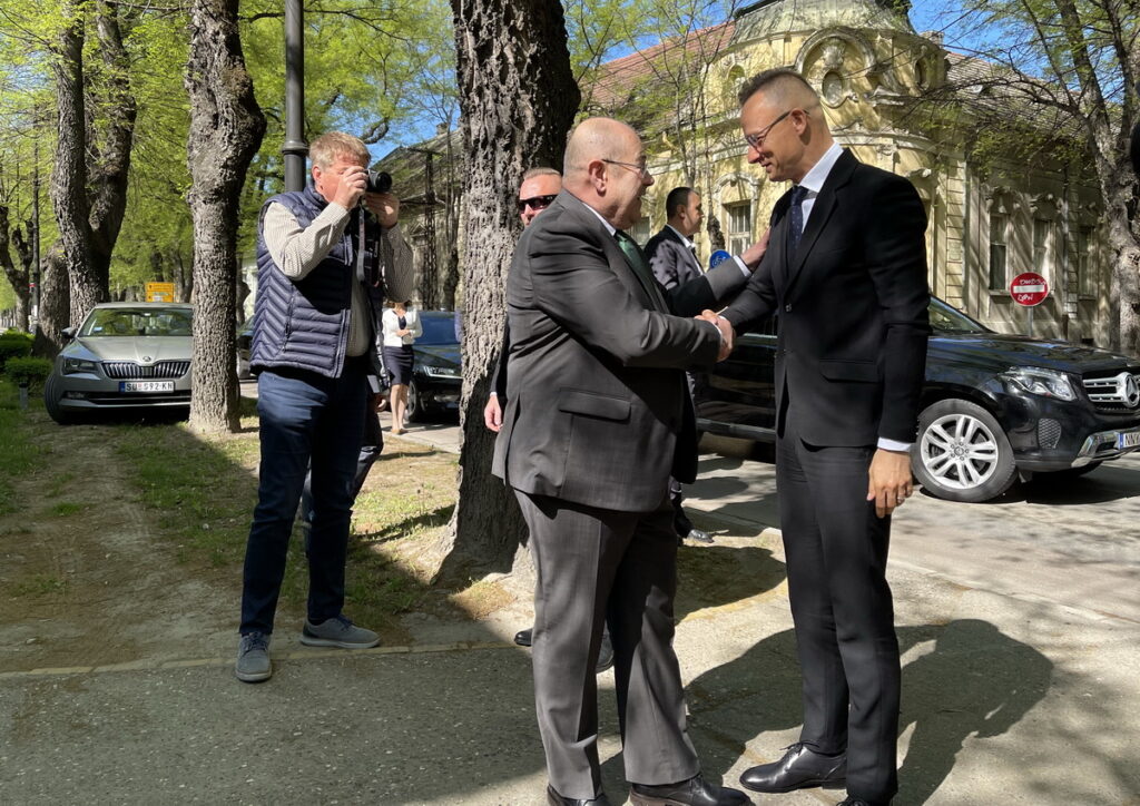 Pásztor István és Szijjártó Péter Szabadkán a VMSZ székháza előtt
