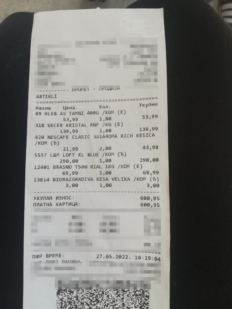 Az N1 portál egyik kúlai olvasója lefényképezte a pénteki vásárlás során kapott blokkot, melynek tanúsága szerint a zsákból mért cukor kilogrammjáért 139,99 dinárt fizetett.