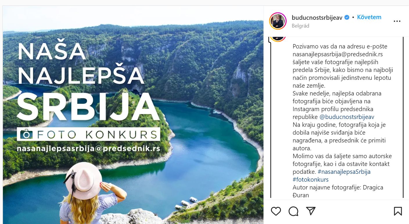 Mobil a zsebbe, fényképezőgép a táskába és indulás fotókat készíteni az országról – ez az üzenete az Aleksandar Vučić által közzétett felhívásnak. A szerb elnök az Instagram oldalán arra kérte a polgárokat, hogy küldjenek fotókat a szépséges Szerbiáról a nasanajlepsasrbija@predsednik.rs címre, mert így közösen népszerűsíthetik az országot.
