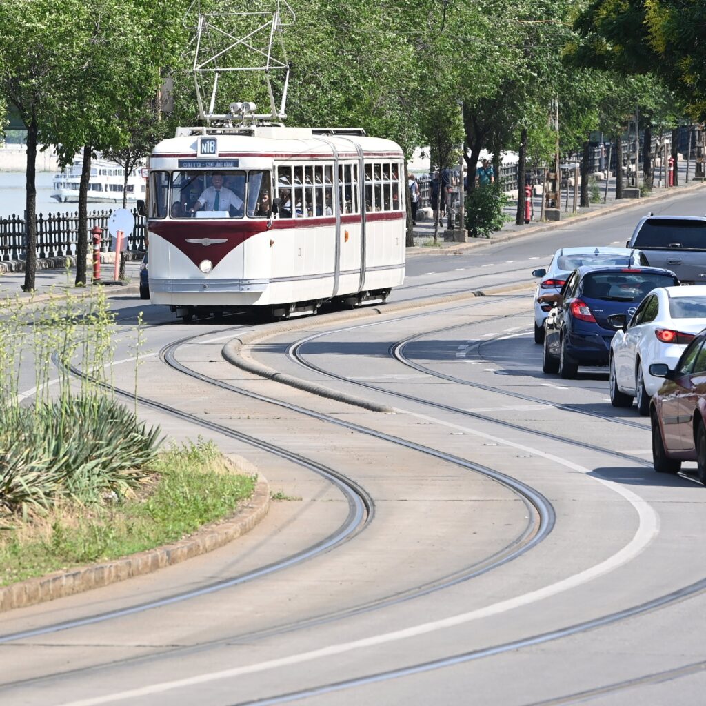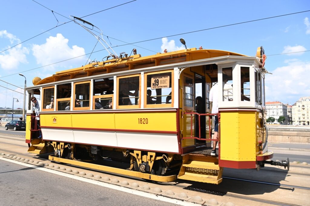 Az 1820-as pályaszámú BKVT S típusú, N19-es nosztalgiavillamos Budapesten, a Döbrentei téren (Fotó: MTI/Máthé Zoltán)