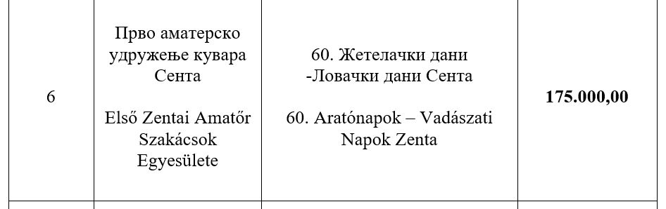 A döntés értelmében, amelyet a község első embere, Czegledi Rudolf, Zenta polgármestere írt alá a az Első Zentai Amatőr Szakácsok Egyesülete a 60. Aratónapok – Vadászati Napok Zenta szervezésére 175 000 dinárt kapott a községi költségvetésből.