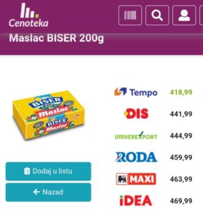 Az Efektiva fogyasztóvédelmi egyesület a Facebooki oldalán tette közzé azokat a fotókat, amelyekről látszik, hogy egy 250 grammos vaj Németországban 2,29 euróba, vagyis 270 dinárba kerül, míg nálunk ugyanez a vaj ára 350 és 470 dinár között mozog.