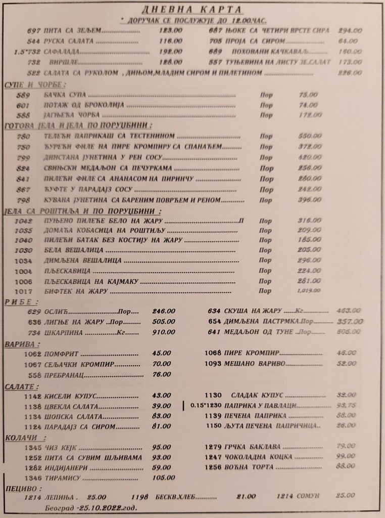 A levesek ára sem változott. A bácskai leves, ugyanúgy, mint augusztusban, most is 75 dinárba kerül, a brokkoli krémleves pedig 74 dinár. A bárányhúsból készült levesért pedig 172 dinárt kell fizetni.