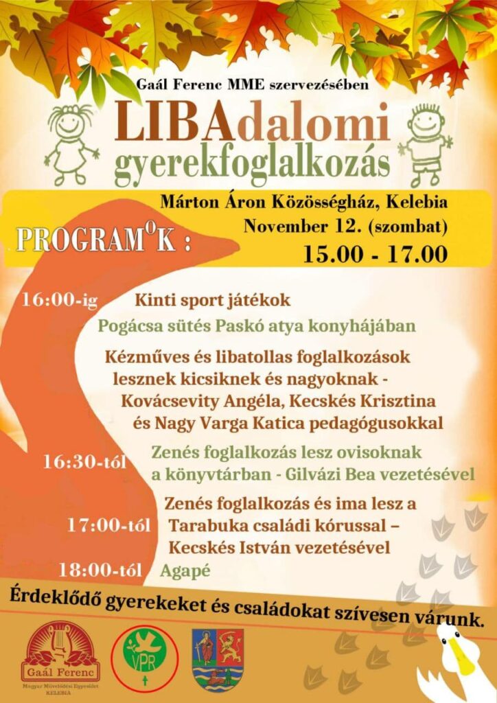 Libadalom címmel tartanak gyermekfoglalkozást november 12-én délután a kelebiai Márton Áron közösségi házban, a Gaál Ferenc Magyar Művelődési Egyesület szervezésében, tájékoztatta szerkesztőségünket Paskó Csaba kelebiai plébános.
