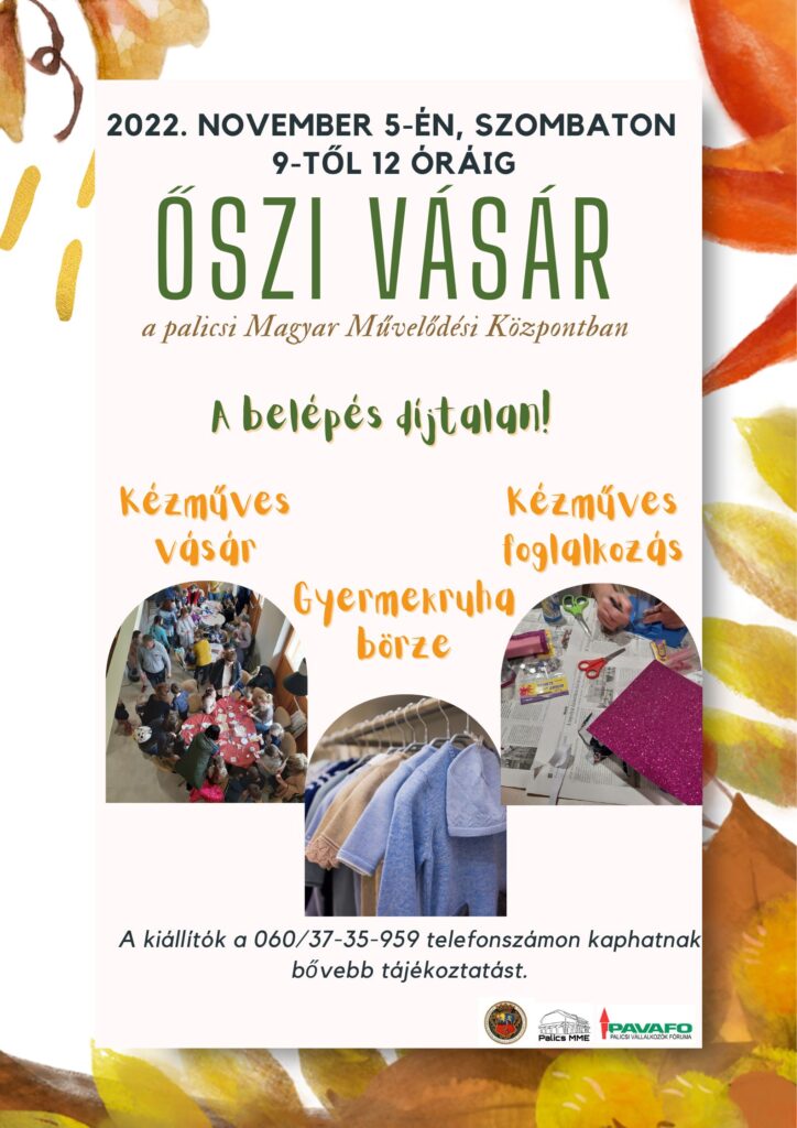 Szombaton, november 5-én 9-től 12 óráig Őszi vásár lesz a palicsi Magyar Művelődési Központban.