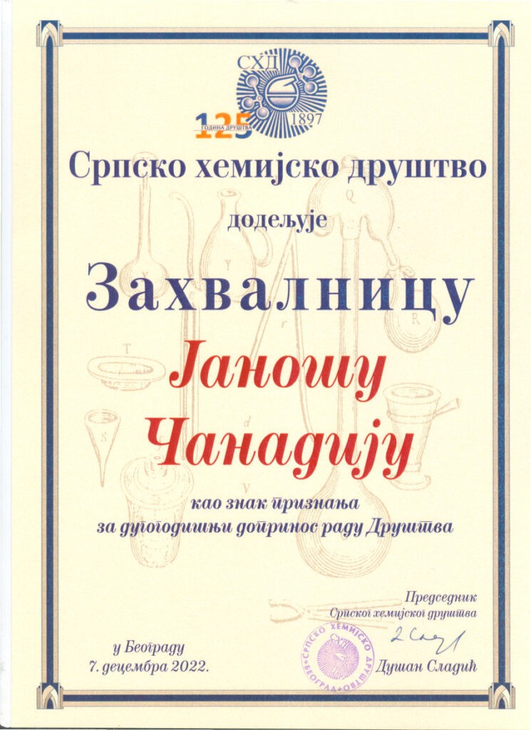 A Szerb Kémiai Társaság 2022 decemberében köszönő oklevelet adományozott Csanádi Jánosnak, az Újvidéki Egyetem Természettudományi-matematikai Kara nyugalmazott egyetemi tanárának, az MTA külső köztestületi tagjának a Társaság munkájához való többéves hozzájárulása elismeréseként.