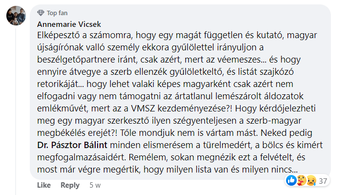 „Elképesztő a számomra, hogy egy magát független és kutató, magyar újságírónak valló személy [azaz Bágyi Ribár Renáta] ekkora gyűlölettel irányuljon a beszélgetőpartnere iránt, csak azért, mert az véemeszes… és hogy ennyire átvegye a szerb ellenzék gyűlöletkeltő, és listát szajkózó retorikáját… hogy lehet valaki képes magyarként csak azért nem elfogadni vagy nem támogatni az ártatlanul lemészárolt áldozatok emlékművét, mert az a VMSZ kezdeményezése?! Hogy kérdőjelezheti meg egy magyar szerkesztő ilyen szégyenteljesen a szerb-magyar megbékélés erejét?! Tőle mondjuk nem is vártam mást. Neked pedig Dr. Pásztor Bálint minden elismerésem a türelmedért, a bölcs és kimért megfogalmazásaidért.”