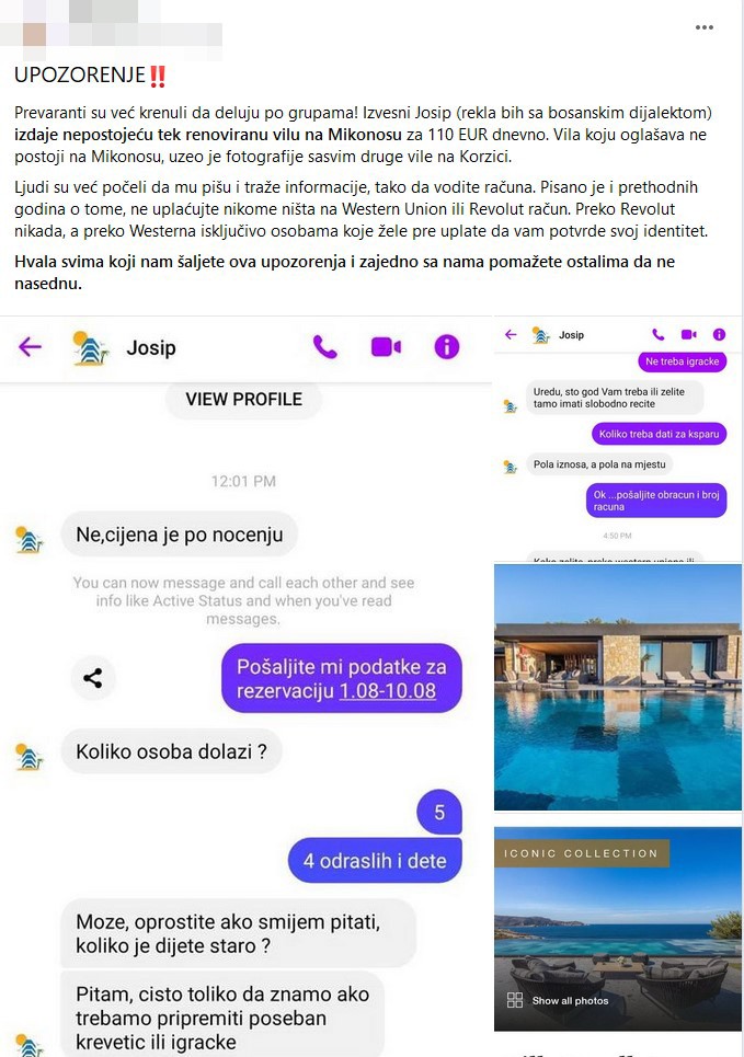 – A csalók máris elkezdtek ténykedni a csoportokban. Egy bizonyos Josip (mondanám, hogy boszniai dialektussal) Mykonoson egy most felújított, de valójában nem létező villát kínál napi 110 euróért. Az a villa, amit hirdet nem is Mykonoson van – az általa használt képeken valójában egy korzikai villa látható. Az emberek már elkezdtek neki írogatni és információkat kérni, úgyhogy legyenek óvatosak! – írták a csoportban és mellékelték a villa állítólagos tulajdonával folytatott üzenetváltást is.