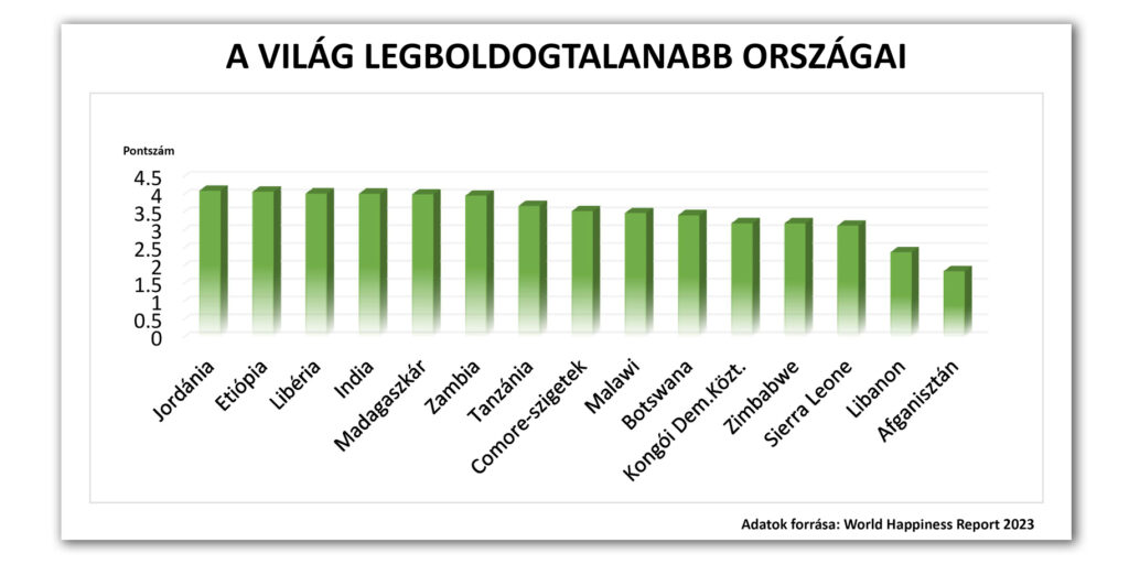 A „boldogságjelentés” listája idén 137 országot tartalmaz. Finnország hatodik éve áll a dobogó legfelső fokán, az ellenpólussal járó címet pedig évek óta Afganisztán birtokolja (ld. második grafikounkat).