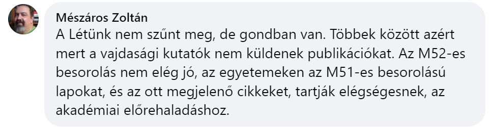 „A Létünk nem szűnt meg, de gondban van. Többek között azért mert a vajdasági kutatók nem küldenek publikációkat. Az M52-es besorolás nem elég jó, az egyetemeken az M51-es besorolású lapokat, és az ott megjelenő cikkeket, tartják elégségesnek, az akadémiai előrehaladáshoz.”