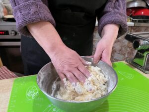 – A fehérlisztet keverem, az éleset a puhával fele-fele arányban. Hogy az arányok jók legyenek, akkor a tojást is mérni kell. Ez egy szép, kétszékű tojás, szép nagy, házi. Ez a tojás most 130 gramm, ehhez a duplája lisztet fogom tenni, ami akkor kettő hatvan – mondja Bea, miközben be is gyúrja ezt az adagot, hogy szemléltesse, hogyan készül a kedvence, a csigatészta.