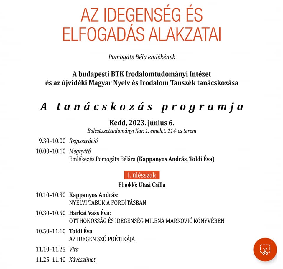 Az idegenség és elfogadás alakzatai című tudományos tanácskozás a budapesti Bölcsészettudományi Kutatóközpont Irodalomtudományi Intézete és az újvidéki Magyar Nyelv és Irodalom Tanszék közötti több évtizedes együttműködést folytató új projektciklus nyitó konferenciája, melyet az idén elhunyt jeles irodalomtudós, Pomogáts Béla emlékének ajánlják.