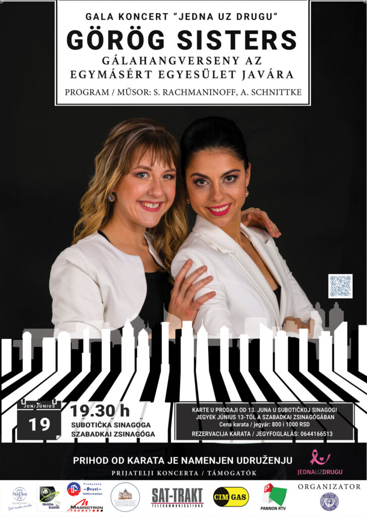 Hétfőn, június 19-én este fél nyolckor jótékonysági gálahangversenyt ad a Görög Sisters zongorakettős a szabadkai Zsinagógában.