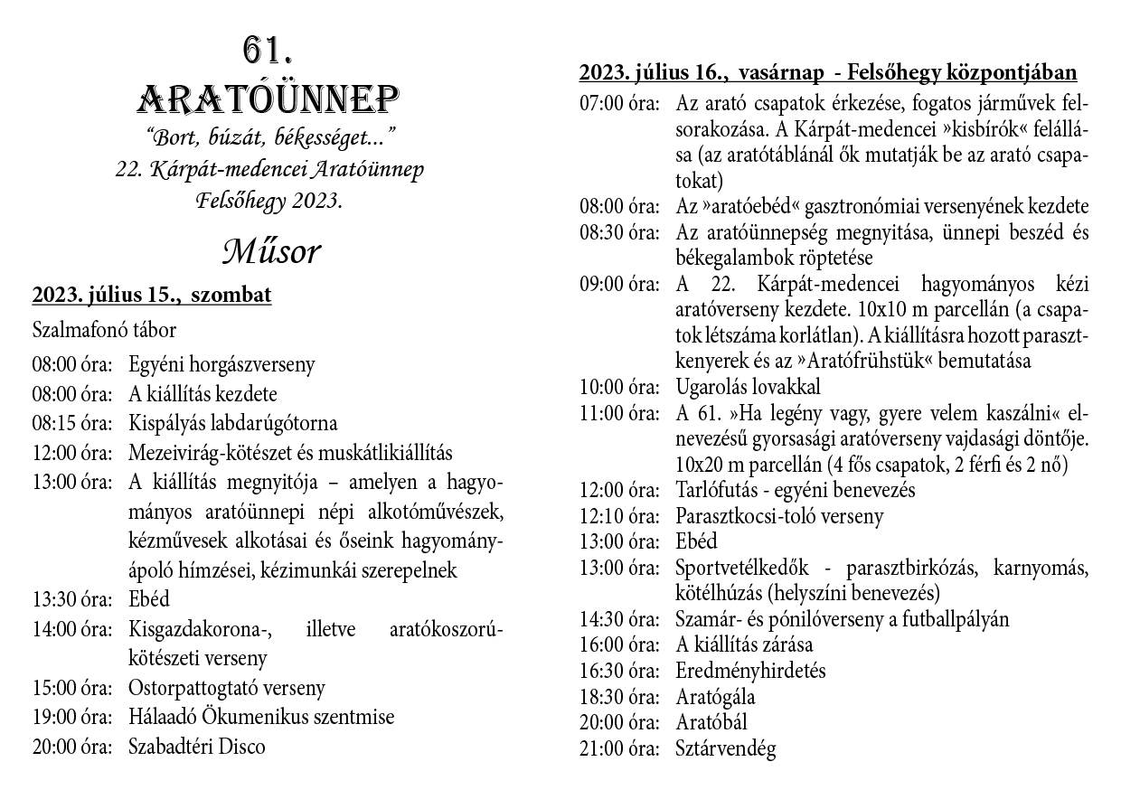 Az aratóverseny kilenc órakor kezdődik a kiállításra hozott aratókenyerek és az aratóreggelik bemutatásával, majd következik az ugarolás és a Ha legény vagy, gyere velem kaszálni elnevezésű gyorsasági aratóverseny vajdasági döntője, amit tarlófutás és parasztkocsi-tolás verseny, parasztbirkózás, karnyomás és kötélhúzás követ. Délután fél háromtól szamár- és pónilóversenyt rendeznek a felsőhegyi focipályán. Az eredményhirdetés délután fél ötkor lesz, amit aratógála, aratóbál és egy sztárvendég fellépése követ.