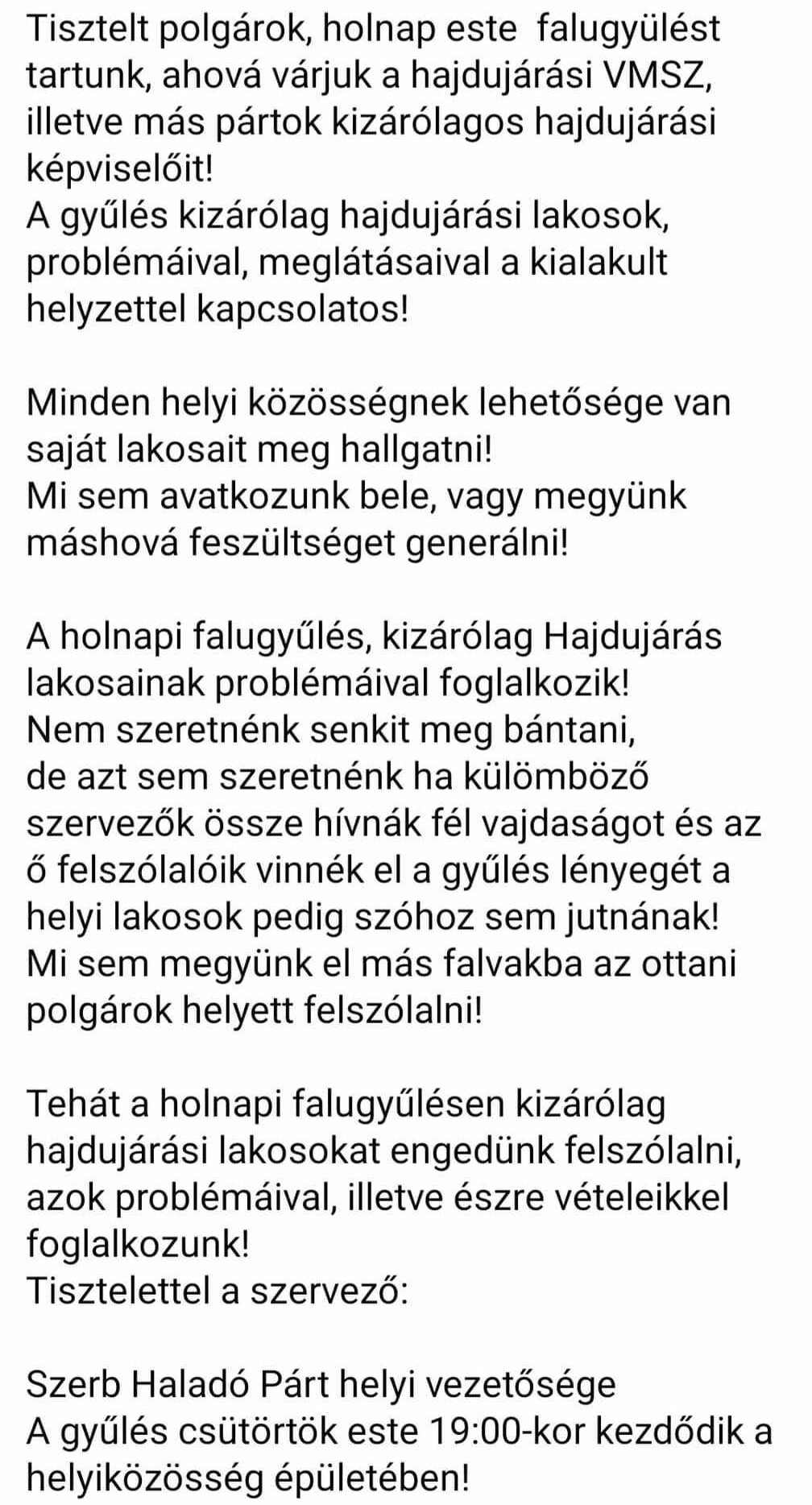 Nem sokkal a felháborodást követően a Szerb Haladó Párt hajdújárási vezetősége a Hajdújárásiak egymásért csoportban közölte, a következő gyűlésen, amelyet csütörtökön tartanak a helyi közösség termében, csakis a hajdújárásiakat várják, hiszen ők sem mennek máshová felszólalni, s a csütörtöki gyűlésen csak a hajdújárási polgárok kaphatnak majd szót.