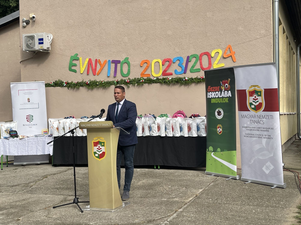 Szakállas Zsolt, tartományi oktatási, jogalkotási, közigazgatási és nemzeti kisebbségi – nemzeti közösségi titkár (balról) és Fremond Árpád, a Magyar Nemzeti Tanács elnöke tanszercsomagokat adnak át az első osztályba induló diákoknak 2023. augusztus 31-én Hajdújáráson – mögöttük Vicsek Annamária, a VMSZ oktatási államtitkára (Fotó: Fremond Árpád/Facebook)