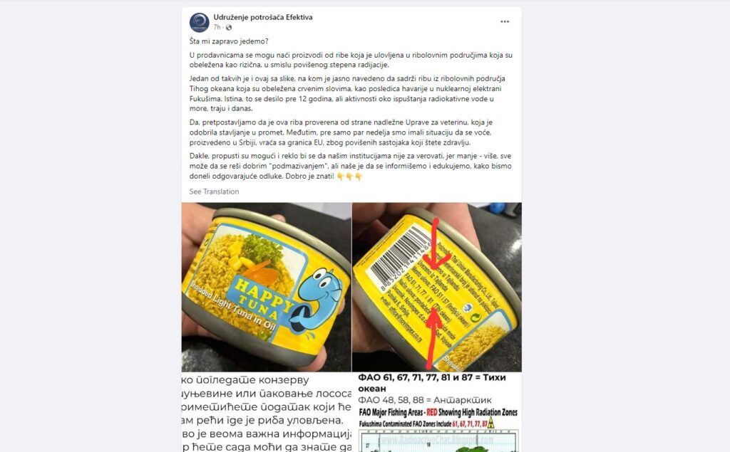 Erre azután került sor, hogy az Efektiva fogyasztóvédelmi egyesület a Twitteren közölte, a szerbiai boltok polcain olyan tonhalat árulnak, amely a radioaktív sugárzás szempontjából kockázatos halászati területről származnak.