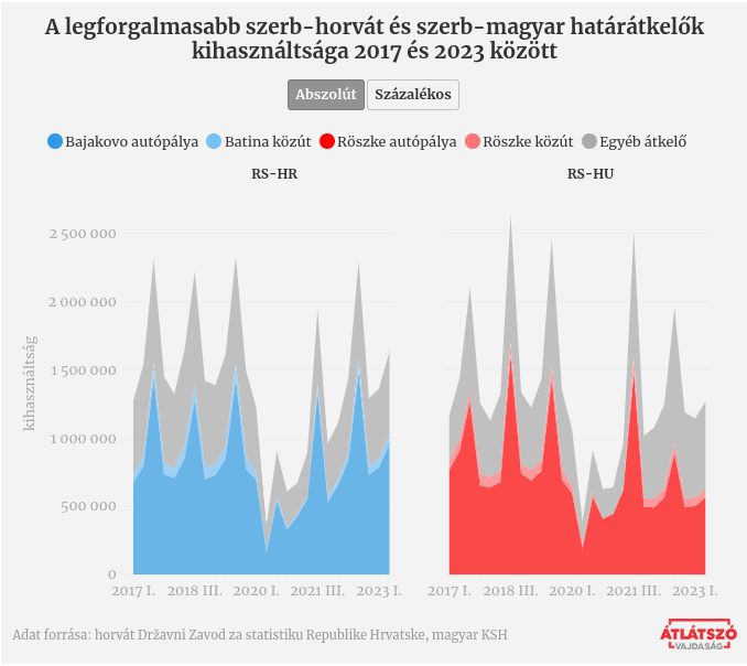 A Horgos-Röszke1 autópálya határátkelő legfrissebb, 2023 júliusi adatai szerint pedig nem csak a COVID előtti időszak forgalmához képest, hanem még a 2021-es adatokhoz viszonyítva is alacsonyabbak a mutatók – igaz, a tavalyi évhez képest 14%-kal nőtt a határátkelések száma.