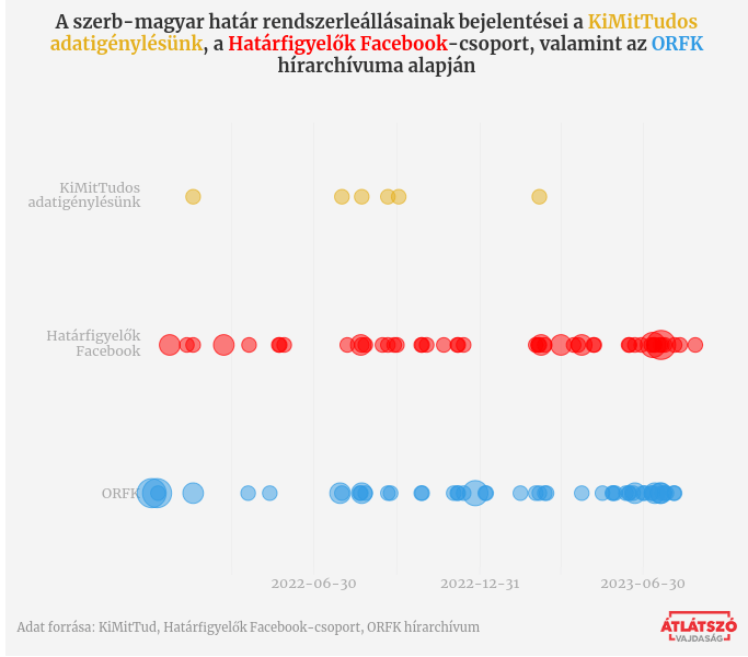 A fent említett hat rendszerleálláshoz képest a Facebook közösségi oldal Határfigyelők csoportjában ugyanerre a periódusra vonatkozóan 59 rendszerleállást jeleztek. Az ORFK hivatalos oldalán pedig 64 bejegyzést találtunk, ami a szerb-magyar határátkelők részleges vagy teljes leállásáról tanúskodott. A leállások időtartamát nem sikerült minden esetben beazonosítani, így táblázatunkban csak a rendszerleállások gyakoriságát jelöltük.
