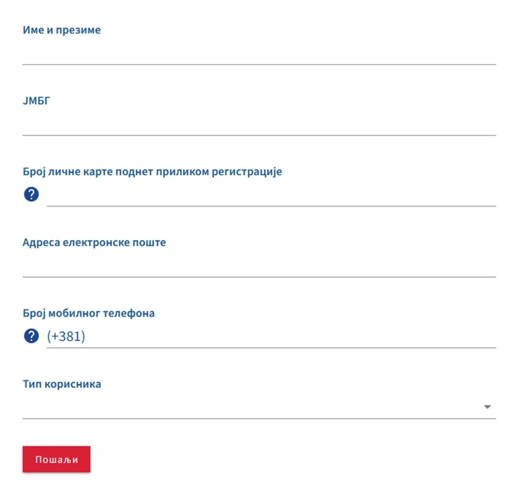 A „Prijava problema” opcióra történt kattintást követően meg kell adni a személyes adatokat, a kereszt- és vezetéknevet, a személyi számot (JMBG), a regisztráció során megadott személyigazolvány-számot, az email címet, a mobiltelefonszámot és a felhasználó típusát. Ezután a „Pošalji” (Elküldés) gombra kell rákattintani.
