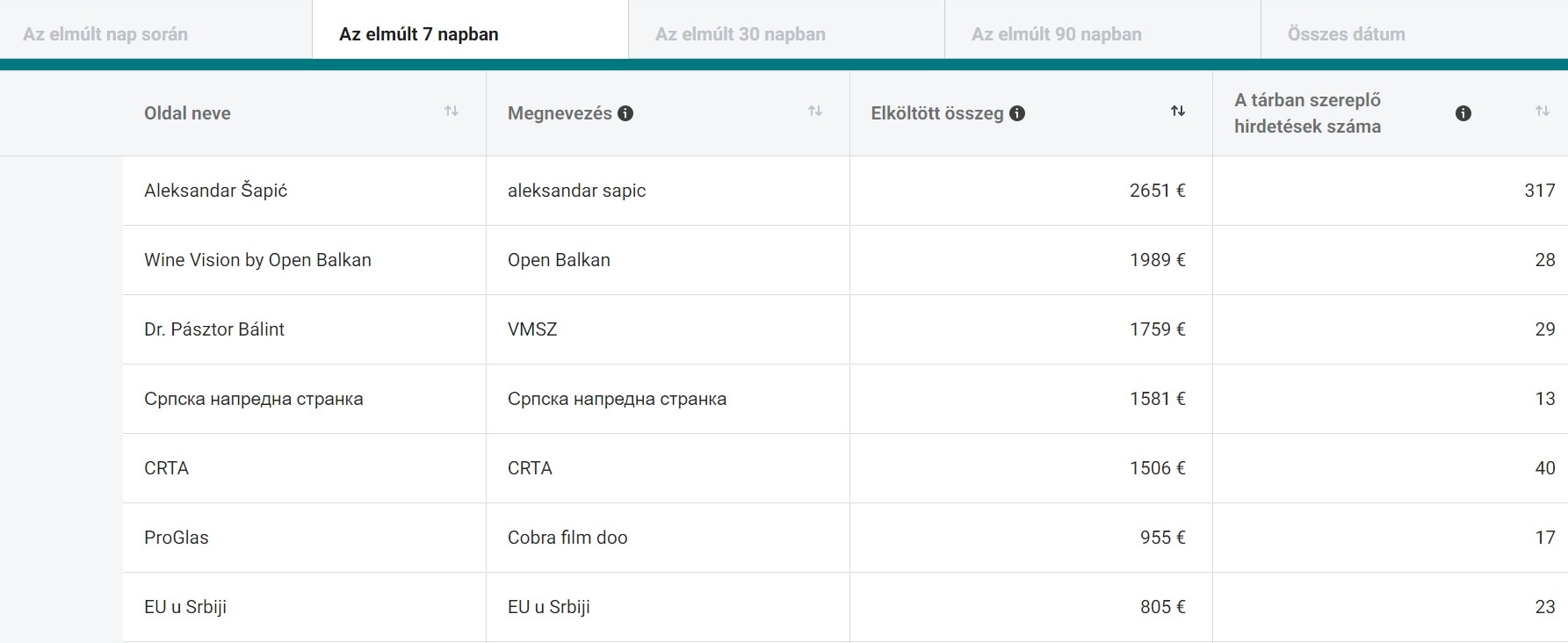 A második helyen a Wine Vision by Open Balkan áll 1989 euróval és 28 hirdetéssel, míg a harmadik helyen Pásztor Bálint található, aki egy hét alatt 1759 eurót költött el (29 hirdetés az adattárban). A VMSZ megbízott elnöke ezzel megelőzte a Szerb Haladó Pártot, amely az elmúlt hét napban 1581 eurót költött a 13 bejegyzésre.