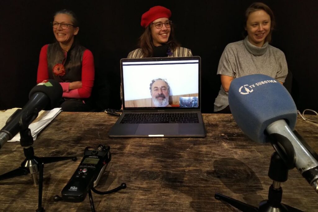 Varga Heni, Salamon Luna és Pámer Csilla személyesen, Döbrei Dénes pedig Zoom kapcsolással a Nyári Mozi Színházi Közösség Sajtótájékoztatóján