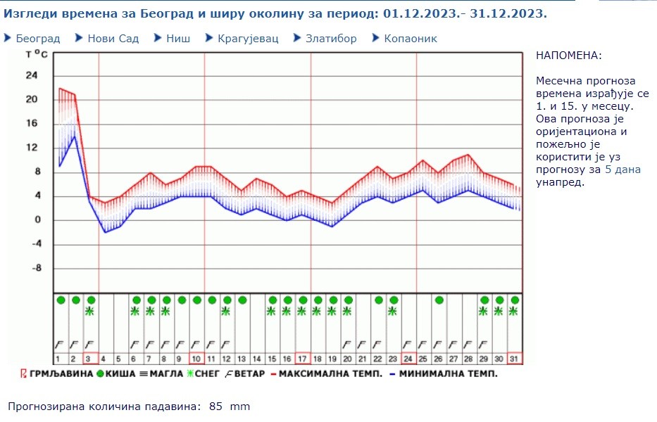 Az RHMZ előrejelzése szerint a fentihez hasonló időjárás várható Újvidéken, Nišben és Kragujevacon is.