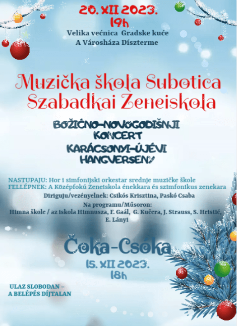 A Szabadkai Zeneiskola középiskolás diákjai hagyományosan idén is karácsonyi-újévi hangversennyel várják a közönséget.