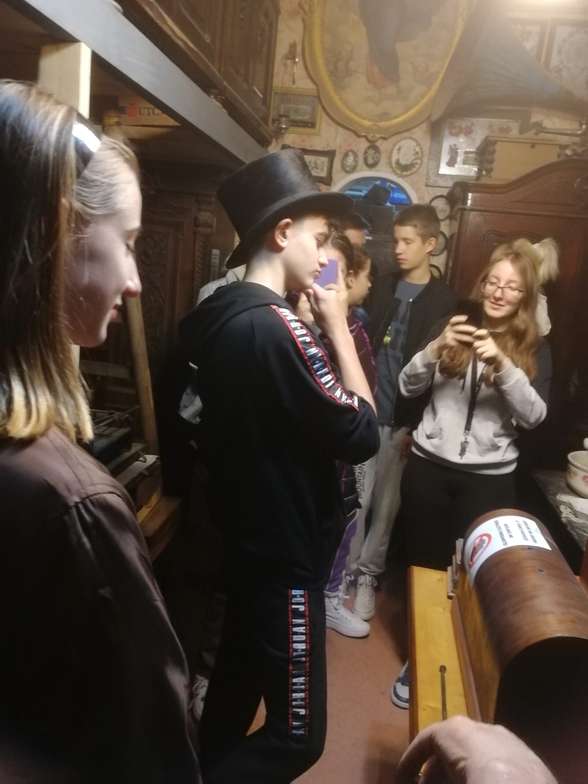 A tanárnőknek nagyon tetszett a látogatás, volt, amelyikük két nap is vállalta, hogy a tanulókat elvezeti hozzánk. Én a karórámon ellenőriztem az idő múlását, és időnként mondtam nekik, hogy iparkodjanak, mert gyorsan közeledik a két óra (120 perc vége), és még a tölcséres gramofont is ki kell próbálnunk. Ezután újra felrakták a fülhallgatókat, és továbbhaladtunk. Egyik fiúnak odaadtam egy cilinderkalapot, hogy próbálja fel, idegenkedett tőle, de amikor eltávolodtam, láttam, hogy a nagy tükör előtt igazgatta a fején, és a jobb kezével fényképet is készített.