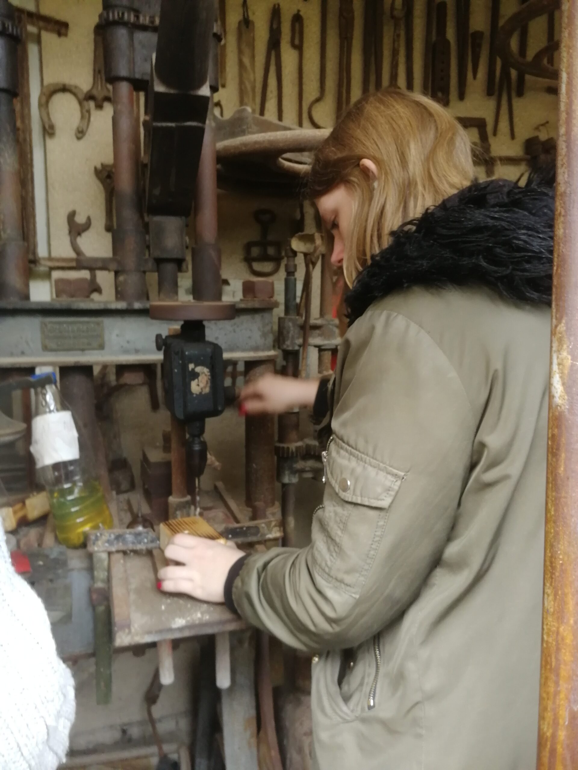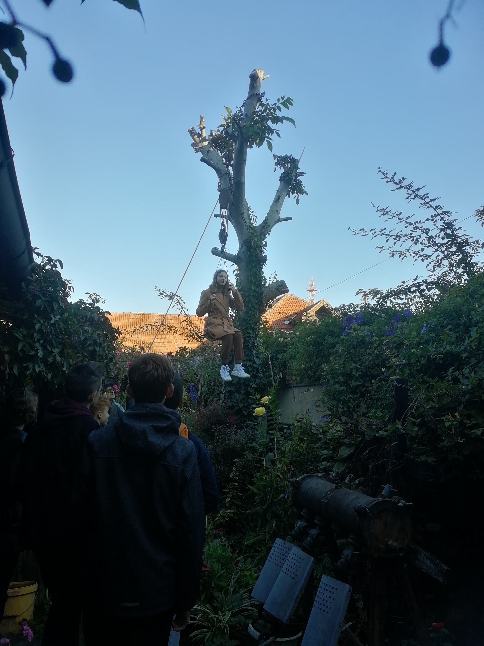 Az udvaron előre kialakítottam öt munkahelyt, így mindenhol ketten, mindkét csoportból egy-egy tanuló tevékenykedhetett. Az első helyen a műanyag vízvezetékcsöveket szabták-vágták és erősítették össze hevítéssel, a másodikon a gombpergetési ügyességi játékot próbálgatták, a harmadikon a hőléggépet indították be, és állítgatták a fordulatot. A negyediken kötelet készítettek, az ötödiken pedig az ötcsigás csigasorral emelték fel egymást a diófa tetejére. Ezeknél a tevékenységeknél nem kellett az okostelefont használni, azonban minden csoportnál kellett segédkeznem. A gombpergetés indult be a legnehezebben, pedig ez már több mint százéves ügyességi játék. Még a kísérő tanárnőnek is megtetszett, de nem akarta a tanulók előtt próbálgatni, ám eltett egy példányt, hogy otthon kipróbálja.