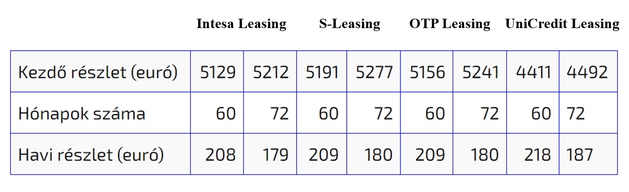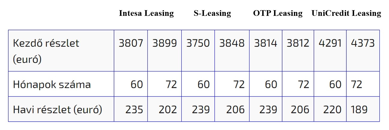 A táblázatban közölt példáknál a kezdő részletbe minden egyéb kiadás is belekerült, kivéve az Unicredit Leasing esetében, amelynél még mintegy 75 eurót hozzá kell adni különféle kiadások miatt.