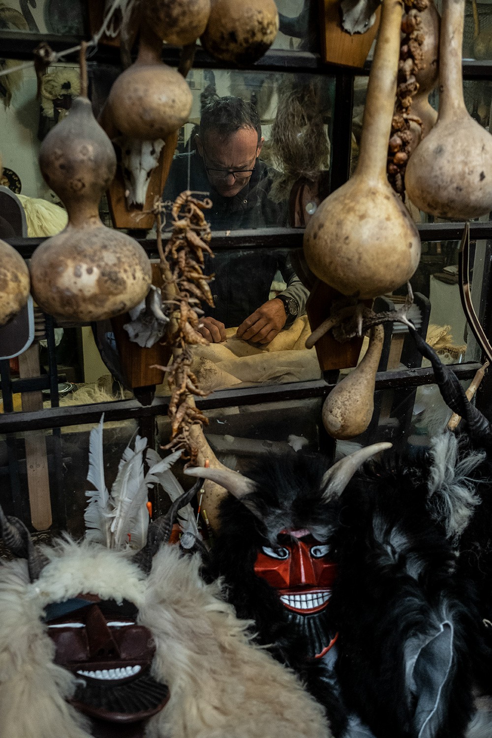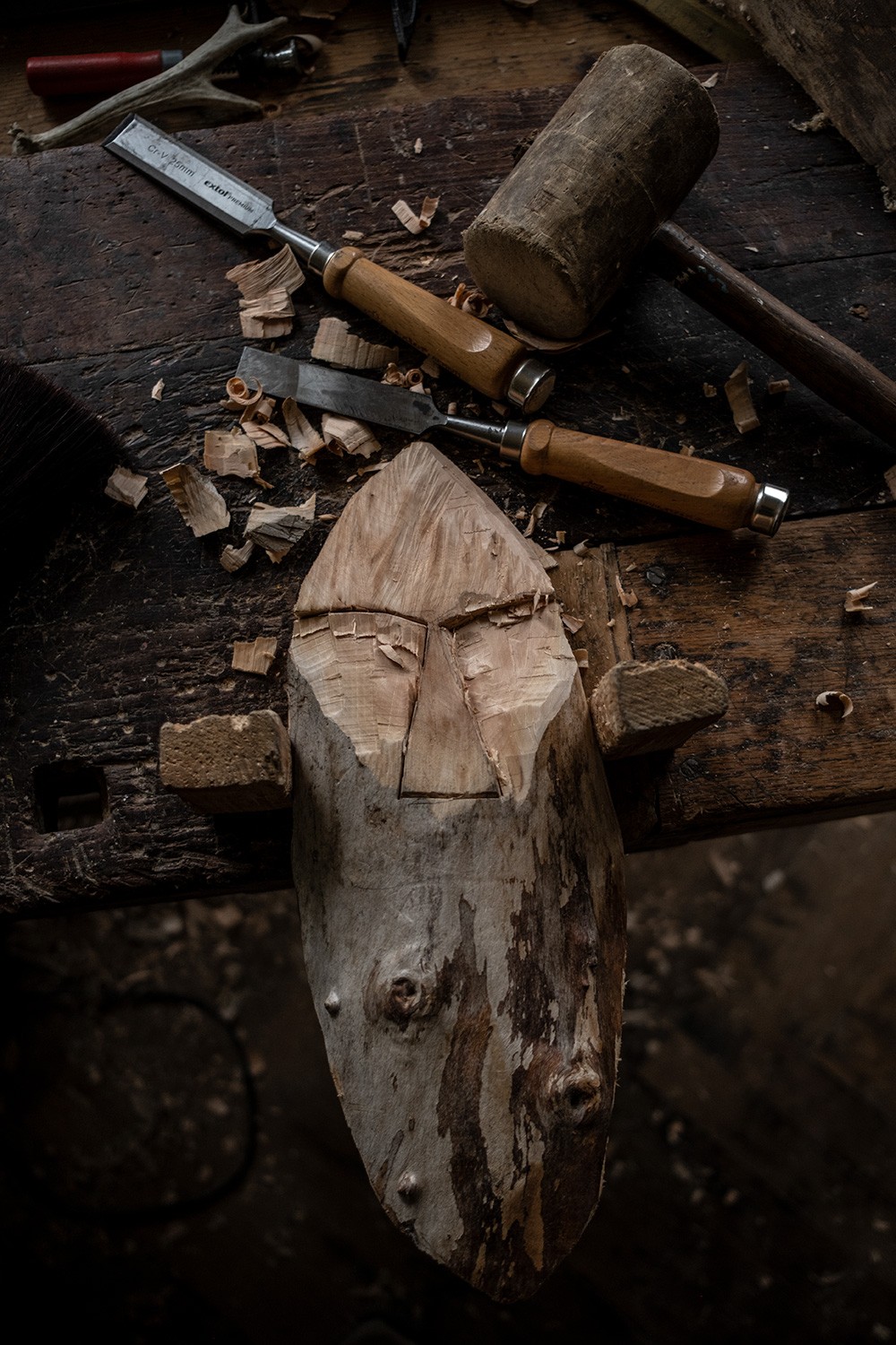 Vigyorgó arcok figyelnek a falakról. Mindenkinek más a grimasza, mindenki egyszerre vicces és gonosz. Kényelmetlenül érzem magam. A mennyezetről különböző formájú és méretű, felfűzött szarvak lógnak. A félhomályos műhelyben szerb népzene szól. Megkérdezem az embert, ez meg hogy, mire azt feleli: kedvelem.