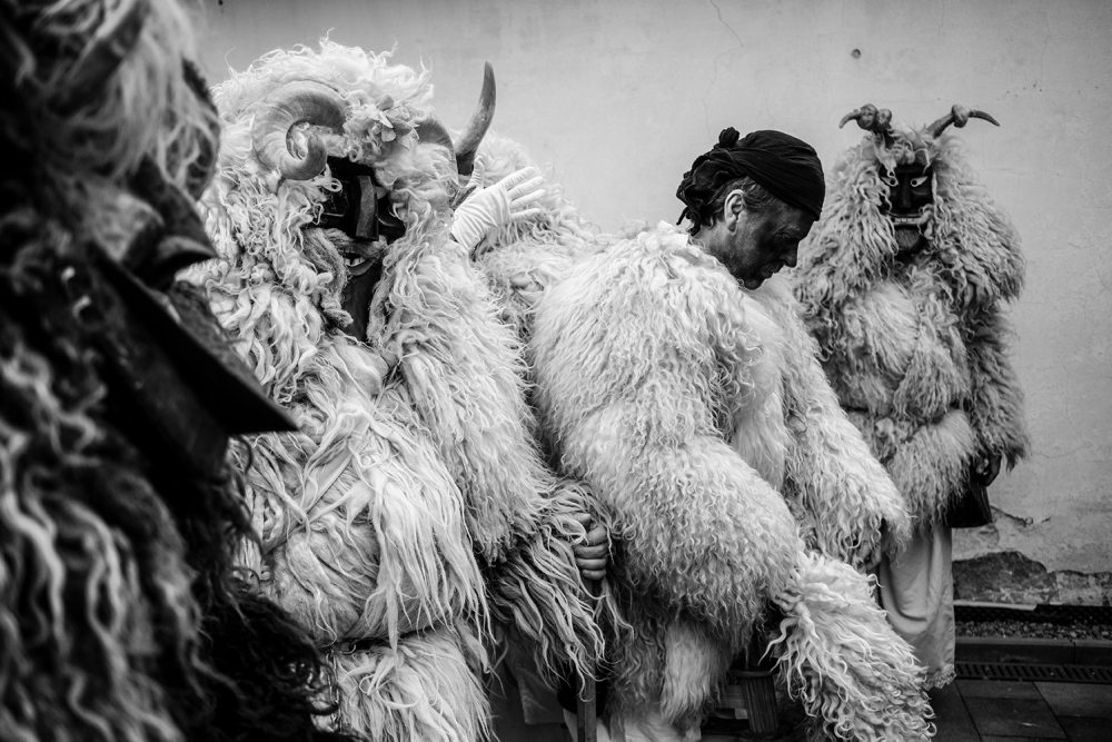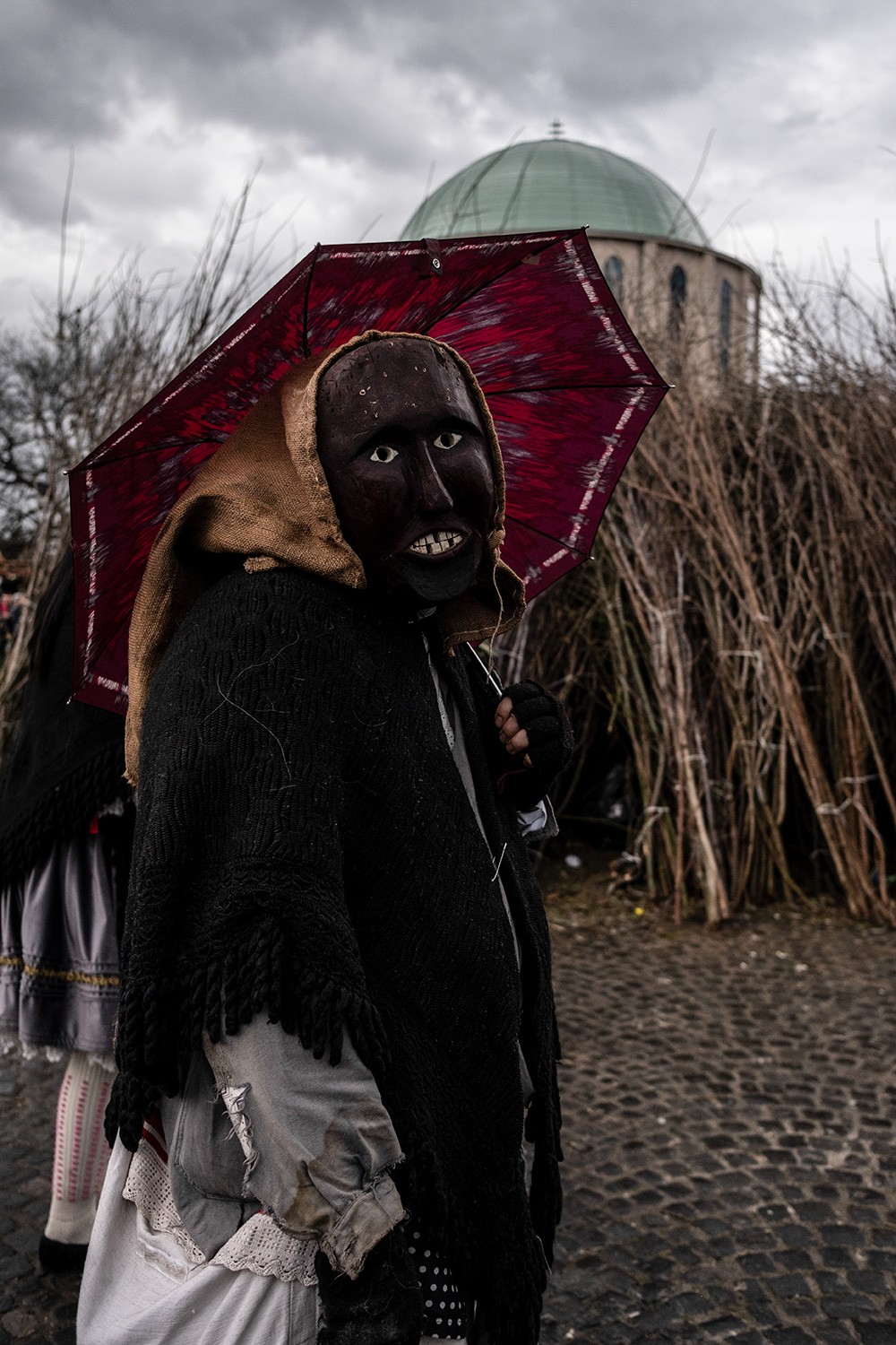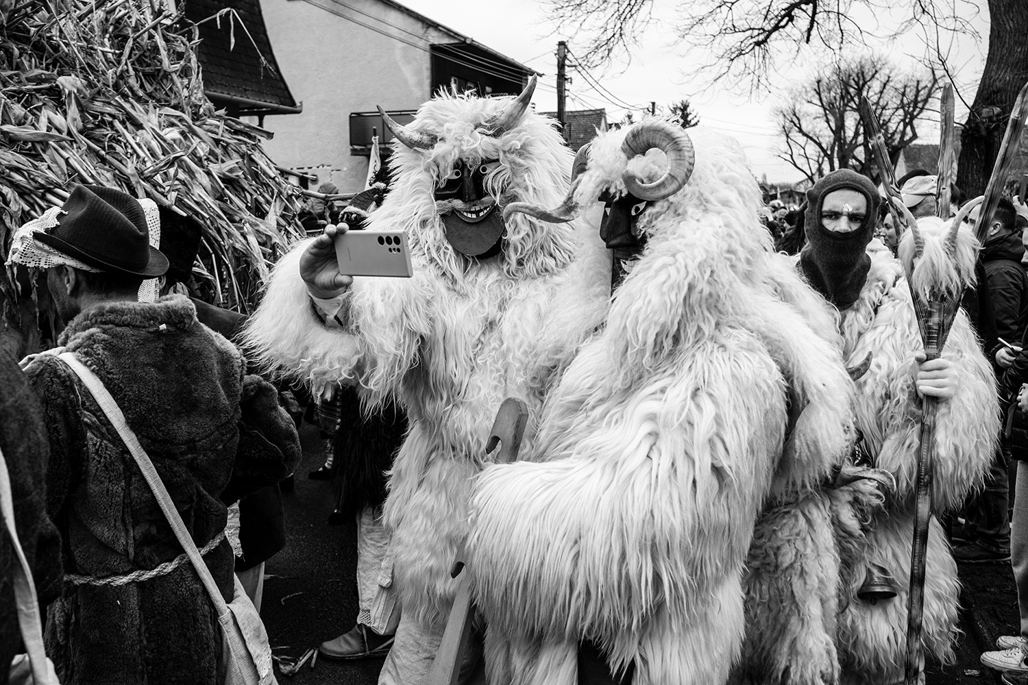 Egy másik busócsoport utcai fellépésére készülődött, amikor észrevettem két busónak öltözött lányt. Azonnal láttam, hogy ódzkodnak a fényképezőgépemtől, attól féltek, hogy álarc nélkül fotózom le őket. A szokásuk szabályait tiszteletben tartva nem készült róluk fénykép.