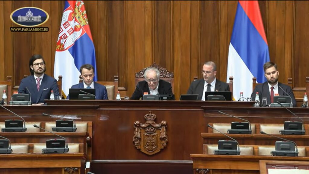 A parlament ülését a legidősebb képviselő vezet. Az elnöklő mellett ott ül Slobodan Milošević unokája is.