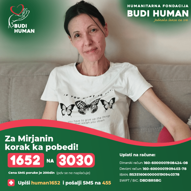 A szabadkai Mirjana Krnajski (45) a szklerózis multiplex súlyos formájában szenved, vágya pedig az, hogy stabilan meg tudjon állni a lábán és megölelhesse a lányát. Mirjana vágya teljesülhet, amennyiben eljut Oroszországba, ahol a legmodernebb, 50 000 euróba kerülő orvosi beavatkozáson esik át. A rokkantnyugdíjból és gondozási segélyéből élő egyedülálló anyának ez óriási összeg, ezért szüksége van a segítségünkre.