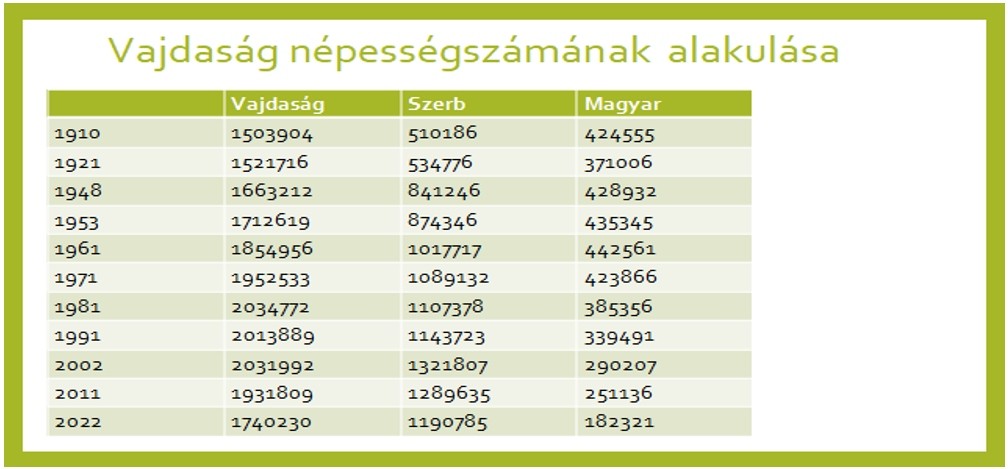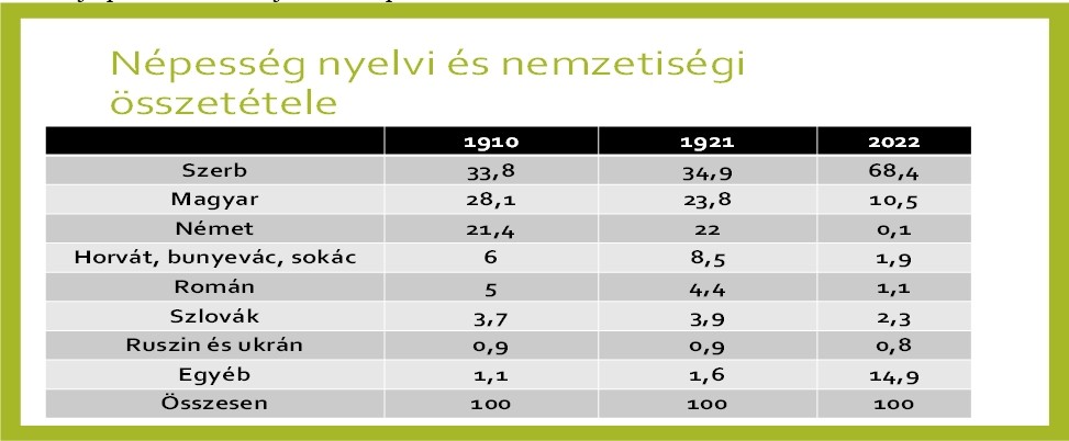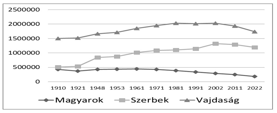 A magyar népességszámmal (mintegy 500.000 vajdasági magyar) az 1960-as évekig nem volt gond, de utána egy stabil lejtmenet van. Fontos rámutatni, hogy hogyan fordult meg az összlétszámon belül az arány a vajdasági nemzeti összetételt illetően: 1910-ben a szerbek a vajdasági lakosság 33,8 százalékát tették ki, 2022-ben pedig már a 68,4 százalékát. A magyarok 1910-ben a lakosság 28,1 százalékát képezték, 2022-ben pedig már csak a 10,5 százalékát. A német lakosság (1910-ben még 21,4 százalékban voltak jelen) szinte teljesen eltűnt. Az őshonos itt élő kisebbségek is nagy arányvesztést szenvedtek el. Egyes vajdasági községekben megfeleződött a magyar népesség.