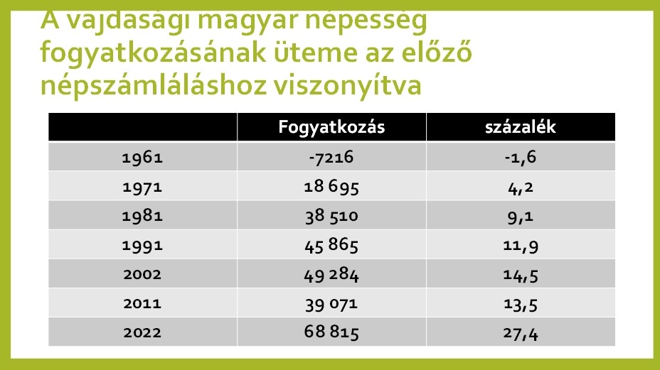 Köszöntőjében Csányi Erzsébet, a VMAT elnöke elmondta, hogy a 2022-es népszámlálási adatok szerint 182.321 magyar nemzetiségű lakos él Vajdaságban, miszerint csaknem 70.000 fős, drasztikus csökkenés történt az elmúlt tíz évben. Ebből kifolyólag ez a vajdasági magyar közösség jelenleg legégetőbb, nagyon kijózanító kérdése, amivel foglalkozni kellene.