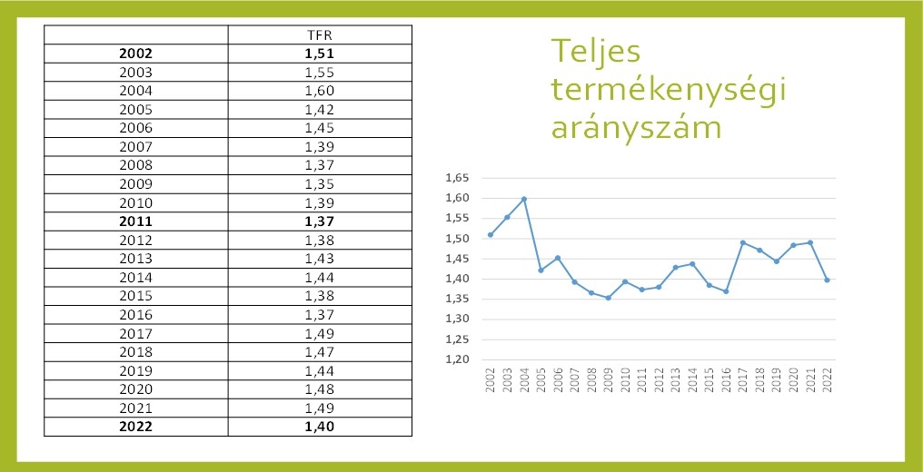 A szülőképes nők nagyjából ma is annyi gyermeket vállalnak, mint húsz évvel ezelőtt (2002-ben 1,51 gyermeket vállaltak, 2022-ben 1,40-et), csakhogy a szülőképes nők száma csappant meg drasztikusan (megfeleződött).