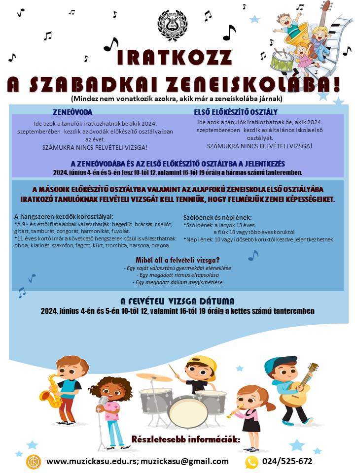 Az érdeklődők minden egyéb információt megkaphatnak az 572-672-es telefonszámon illetve a a muzickasu@gmail.com e-mail-címen. Mirjana Skobo és Guzsvány Lénárd igazgatóhelyettesek a 064/302-16-58-as telefonszámon állnak az érdeklődők rendelkezésére.