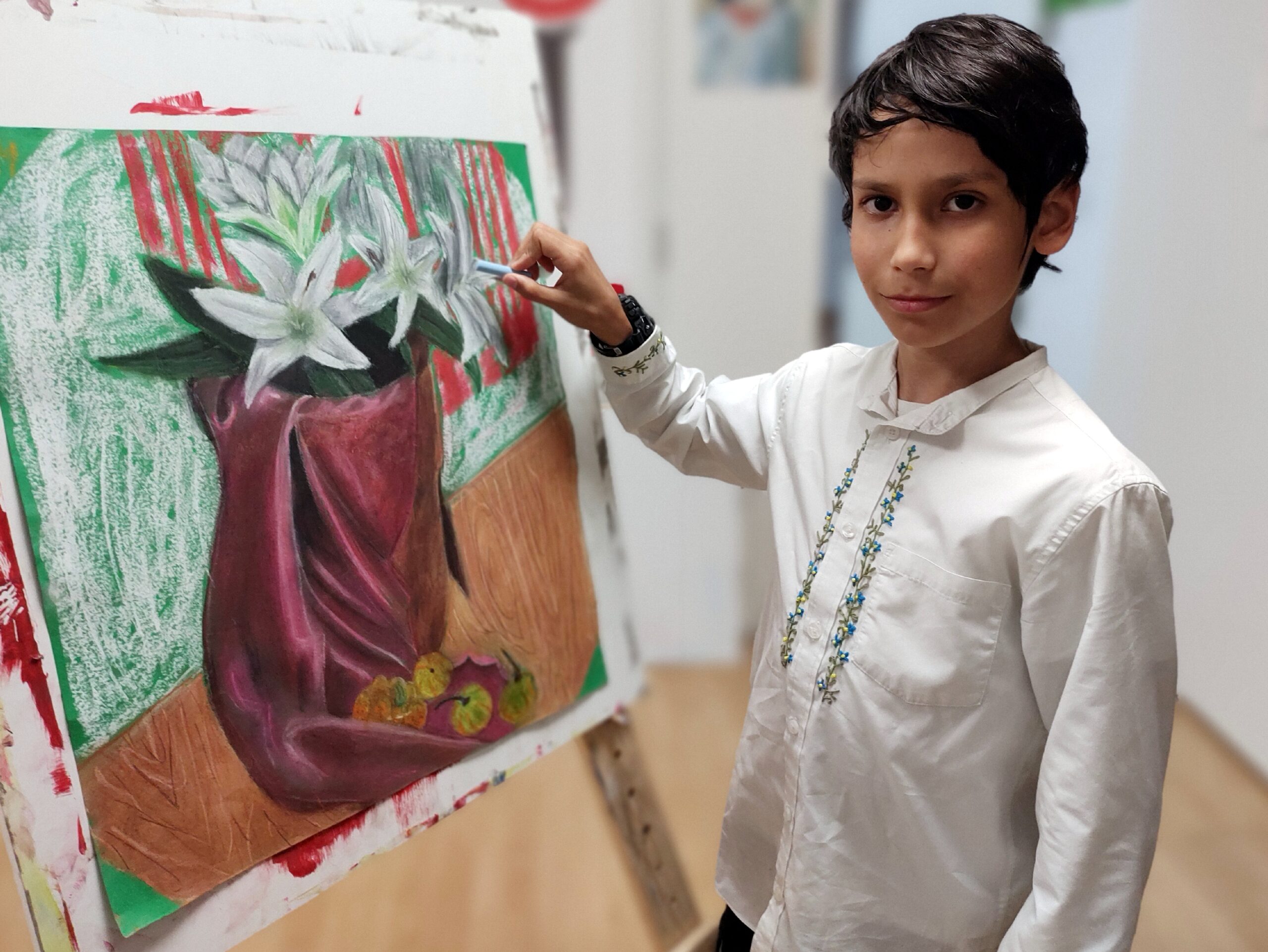 – Nekem nagyon jó itt. Nagyon tetszett, hogy például a múlt héten vízifestékkel dolgoztunk, egy sárkányt festettem, ezen a héten pedig agyagoztunk, de az év során használtunk a képeinkhez akril festéket, tust, lenyomatokat készítettünk linóleummetszettel, szóval sok mindent kipróbáltunk. Legjobban akvarelleket szeretek festeni, ez talán a kedvenc technikám, a legnehezebbnek pedig az agyagozást éreztem – legalábbis amikor először agyagoztunk –, mert nehéz volt megformálni az anyagot. De már másodszor dolgozunk vele, és sokkal jobban megy, mert már tudom, hogyan kell bánni vele. Több dolog is akad, amiért szeretek ide járni, vannak itt barátaim, sokat tudok rajzolni, tanultam új dolgokat, jobban rajzolok, mint az elején és a tanárnő is kedves és segítőkész. A rajzon kívül járok még mazsorettre, tanulok szavalni, teniszezni, de egyáltalán nem fárasztó, szeretem, amikor körülöttem történik valami. Jó az, ha iskolán kívül is van elfoglaltságunk, megismerkedünk új dolgokkal, s ki tudja, lehet, hogy abban nagyon jók leszünk. De ha nem próbáljuk ki, sose tudhatjuk meg. Néha kicsit nehéz, egy-egy feladat igazi kihívás, de nagyon sokat lehet fejlődni, így én mindenképpen folytatni fogom a rajzórákat, mert festő és programozó szeretnék lenni, ami két külön világ, de szerintem jól megférnek egymás mellett.